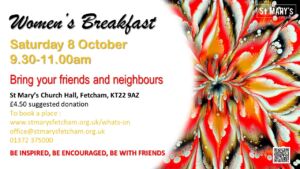 Women’s Breakfast: Sat 8 Oct, 9.30-11am – We are nearly at full capacity, don’t forget to book!. Once again we are to invite ladies to our Women’s Breakfast. Along with our speaker we will offer the usual delicious breakfast for a suggested donation of £4.50. Please book through MyChurchSuite, via the website or contact the Parish Office. Numbers are limited to 60 places so please book early to avoid disappointment. It would be great to have more people helping on the day. If you can help, please contact julie@stmarysfetcham.org.uk. As always, we look forward to meeting old friends and making new ones!