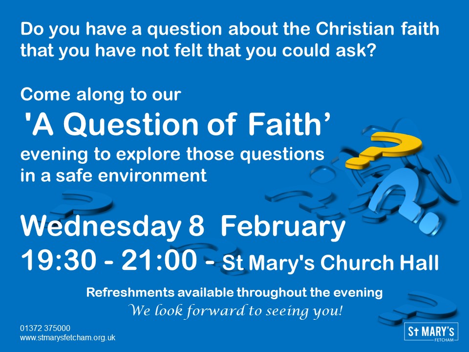 Question of Faith? – Wed 8 Feb, 7:30-9pm: Do you have a question about the Christian faith you have not felt you could ask? Come along to our ‘A Question of Faith’ evening to explore those questions in a safe environment. Refreshments available throughout the evening at St Mary’s Church Hall. We look forward to seeing you!