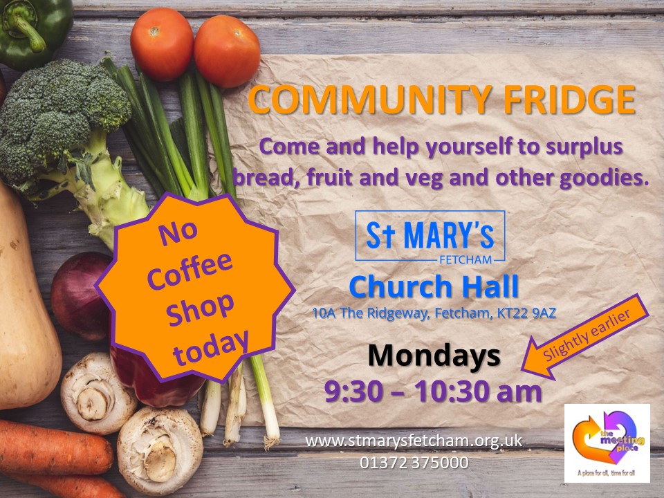 Community Fridge – Mon 8 May, 9.30-10.30am: Due to there being so many Bank Holidays in May we will be opening the Community Fridge 9.30am-10.30am but no coffee shop.