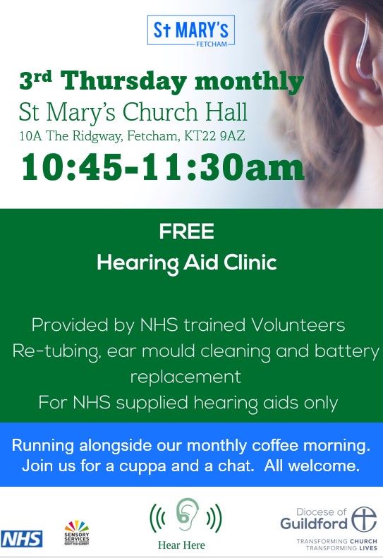 Hear Hear – Thurs 20 July, 10:45 – 11:30am: The NHS Hearing Clinic is run alongside the 10am Holy Communion and Coffee Morning on the 3rd Thursday of the month and is for NHS supplied hearing aids. This is a convenient local benefit, and also give the opportunity to meet new people and have a cuppa.