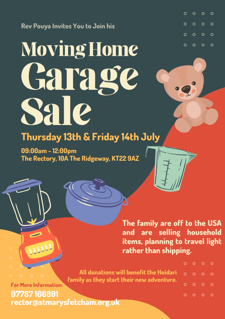 Farewell to the Heidari Family – Sat 8th July, 4-6pm: We are very sad that Pouya and his family are moving to the US this summer where we’re sure God has big plans for them. There have been a lot of legal hoops to jump through but it now seems Pouya’s last Sunday at St Mary’s will be Sunday 16th July.