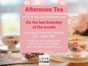Afternoon Tea – Sat 26 August, 3-4:30pm: We welcome the older people in our community to come to the church hall to enjoy tea, chat and occasional entertainment on the last Saturday of each month. Please sign up here, contact the Parish Office on 01372 375000 or office@stmarysfetcham.org.uk Do share with friends and neighbours who you think would enjoy the afternoon. We look forward to the pleasure of your company.
