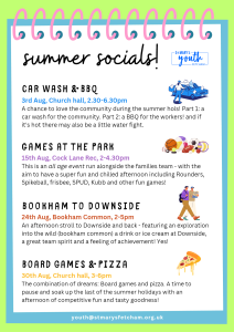 Youth summer socials: All young people in school years 7-13 are welcome to come and invite friends! Please contact Nathan with how to book your young person on: youth@stmarysfetcham.org.uk