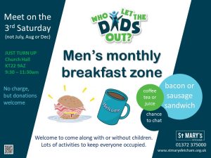 The Coffee Stop – Fetcham Village Hall, Thurs 9-10:30am: Come along on Thursday mornings for a hot drink, something sweet and a chat. We meet in the John Rumble Room (the back hall) at Fetcham Village Hall. There’s a small play area for babies and toddlers. Donations welcome.